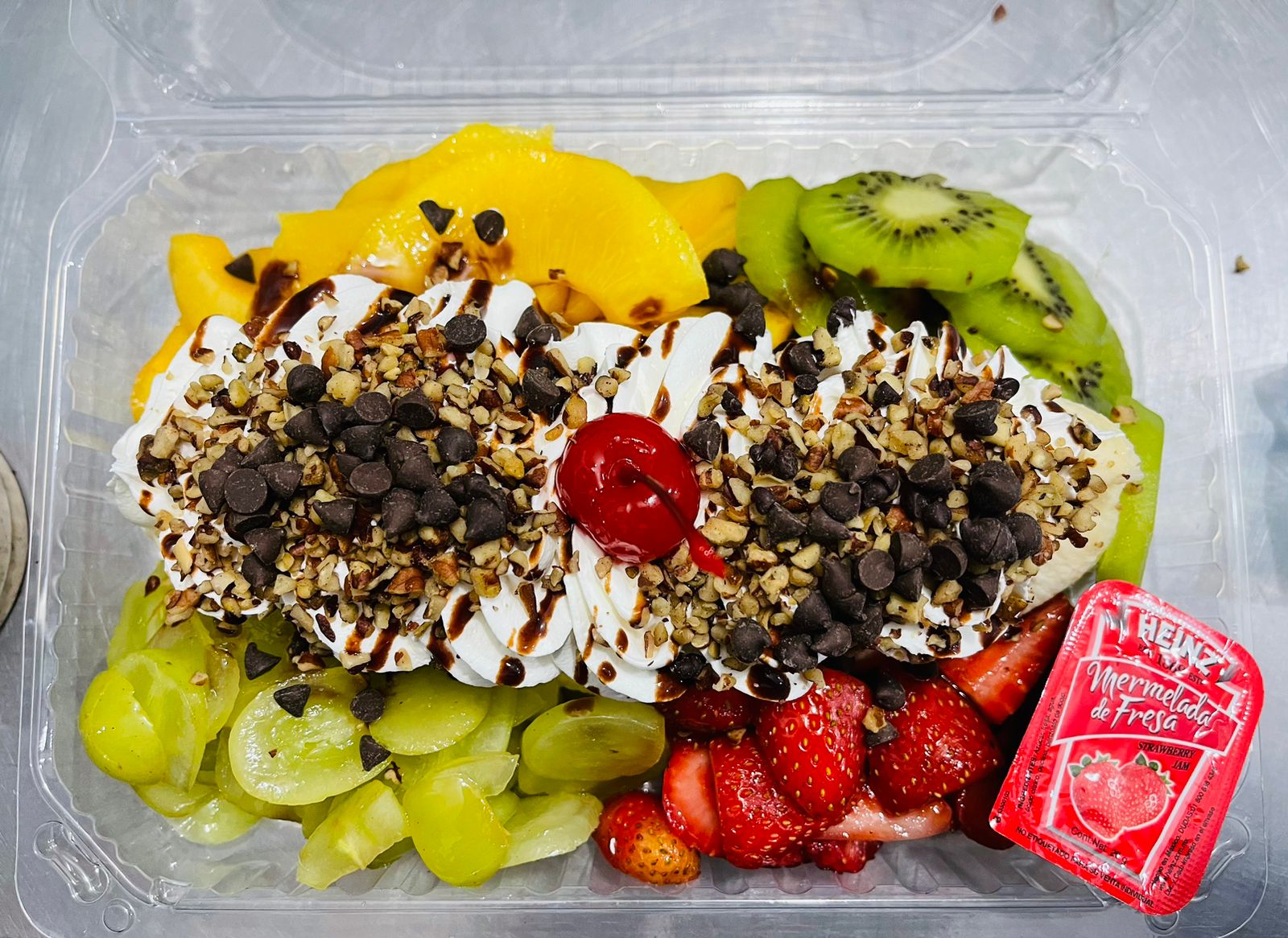 Helado de vainilla, helado de fresa, helado de chocolate, plátano, chantilly, nuez y Hershey´s.