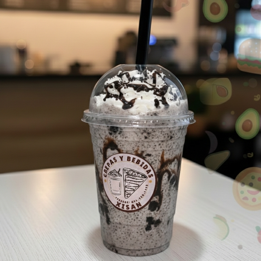 bebida a base de leche, preparada con hielo y delicioso saborizante de calidad sabor Chocolate blanco y galletas oreo, 16 oz