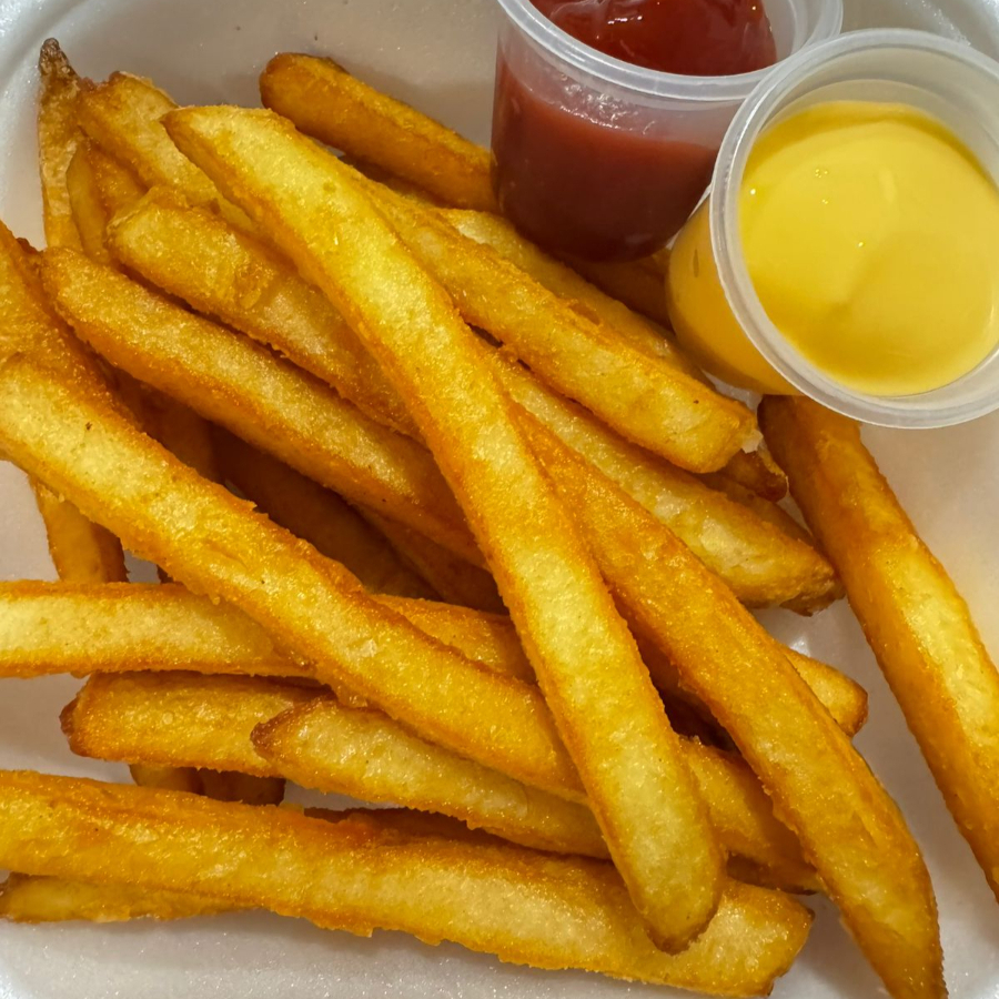 200g de papas a la francesa bien doraditas con queso amarillo y catsup.