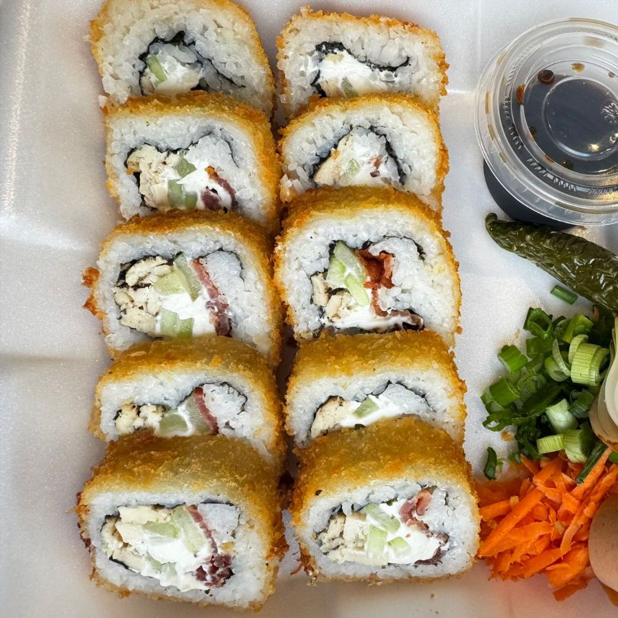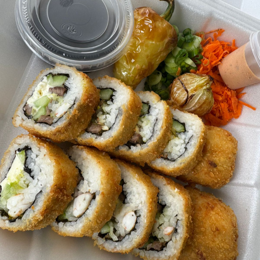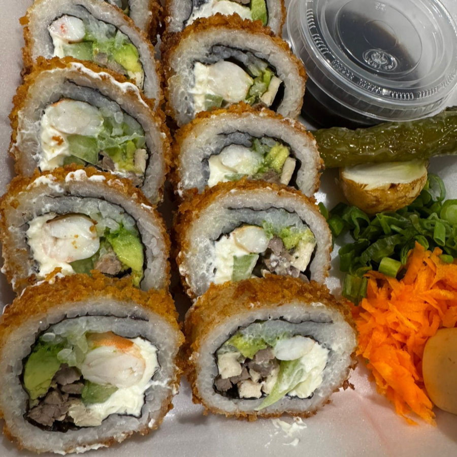 Empanizado, con carne de res, pollo, camaron, aguacate, philadelphia y pepino por dentro