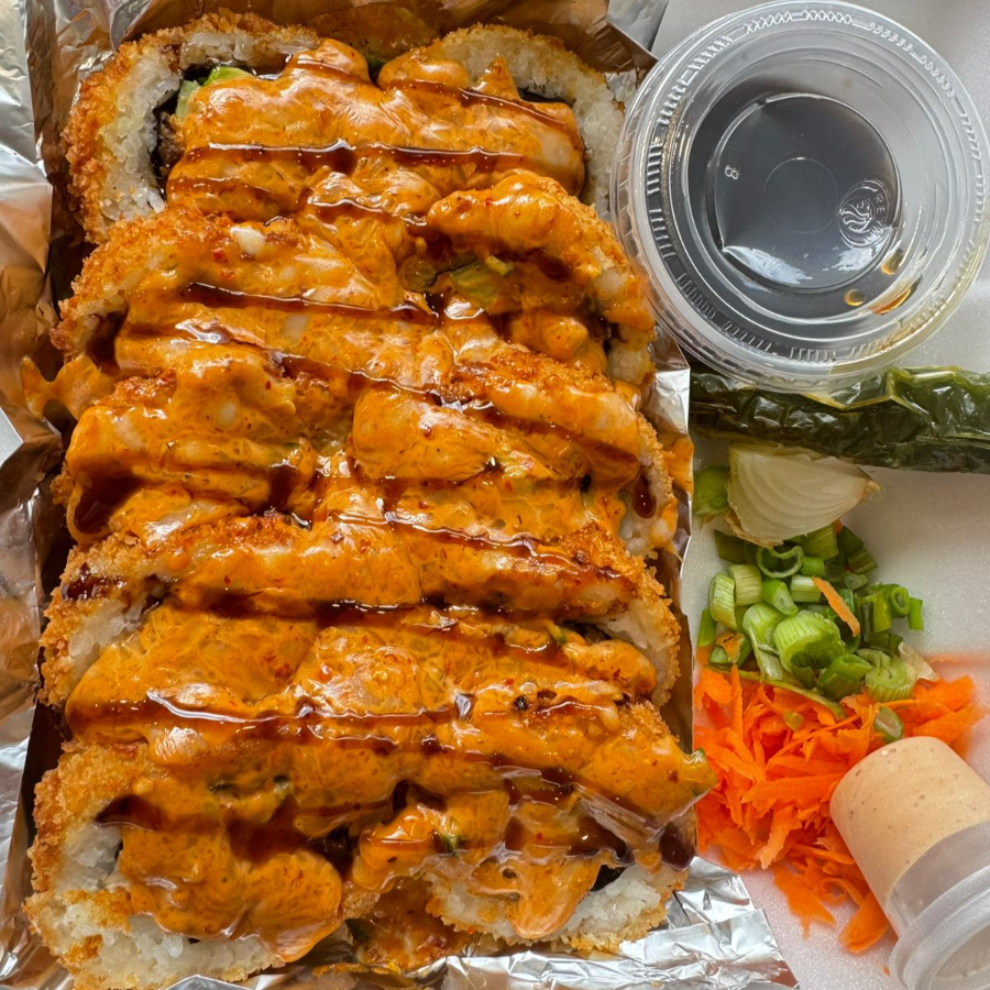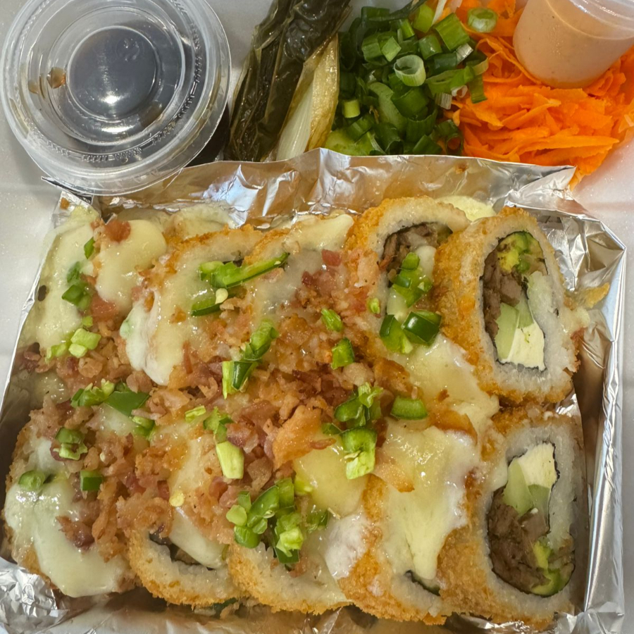 Empanizado, por dentro: camarón, carne, Philadelphia, pepino, aguacate, por fuera: Gratinado con mezcla de tocino, serrano, queso Chihuahua, y aderezo spicy. Bañado en salsa de anguila.