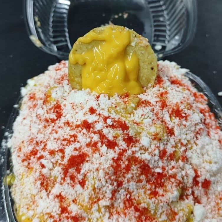 Delicioso Elote de medio litro con crema mayonesa limón queso amarillo y queso blanco