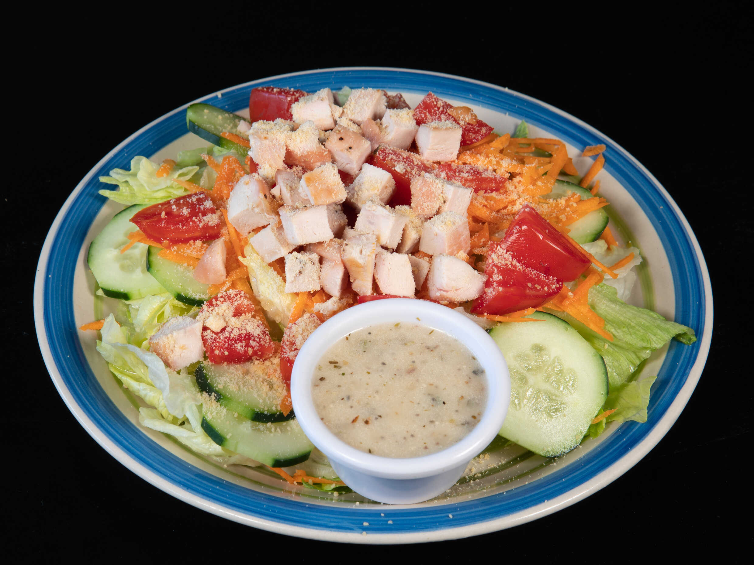 Lechuga, pepino, zanahoria, pimientos, tomate, pollo a la plancha, crutones, queso parmesano y aderezo italiano.