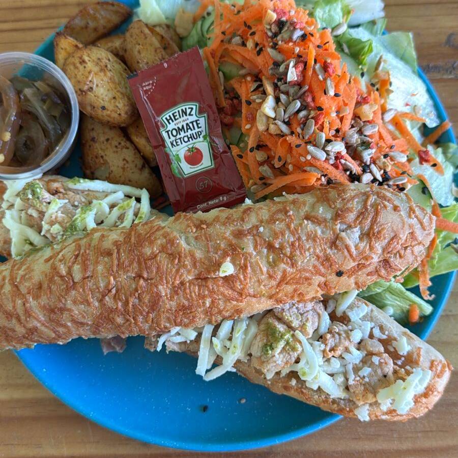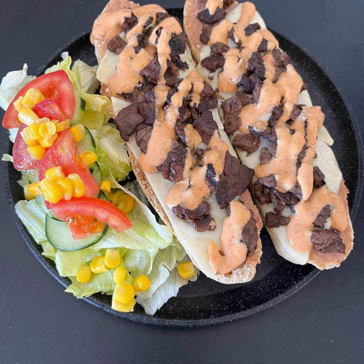 2pz de nuestro baguette de masa madre tostado con frijolitos, arrachera y queso gratinado acompañados con ensalada y aderezo chipotle