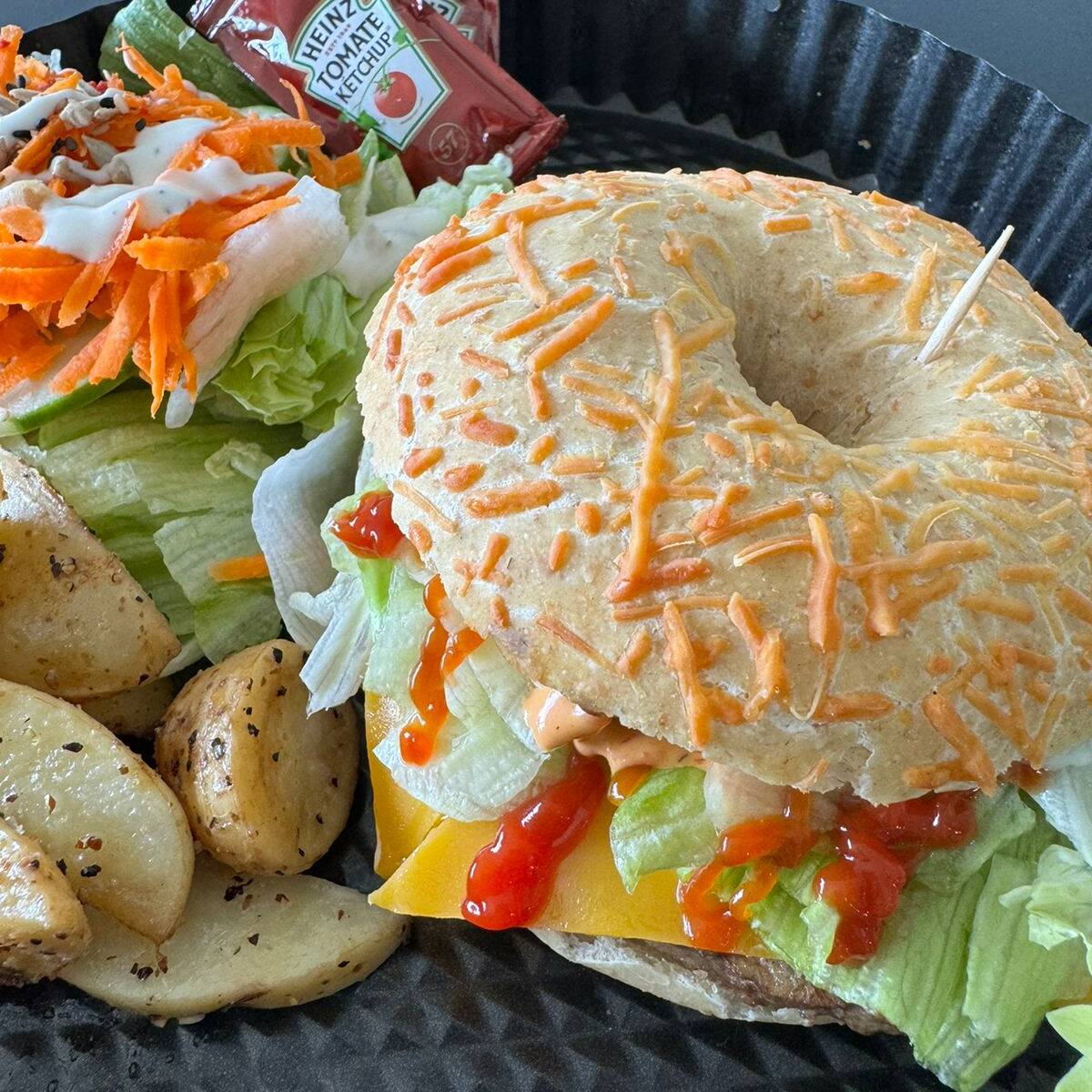 La versión nueva y mejorada de nuestros ya tradicionales bagels, ahora con más pollo y en pan artesanal de masa madre, pruébalo solo o en combo con papas y ensalada .