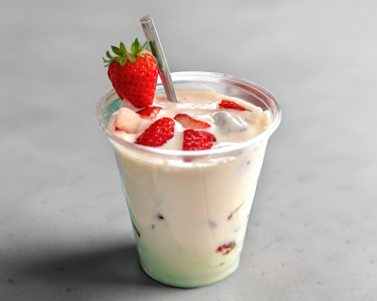 Exquisito frappé de fresas con crema en un vaso de 14 oz