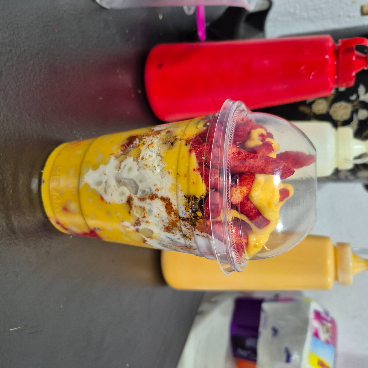 Vaso con queso amarillo, elote desgranado, cheetos flaming hot e ingredientes de tu elección. (El queso amarillo no es opcional)