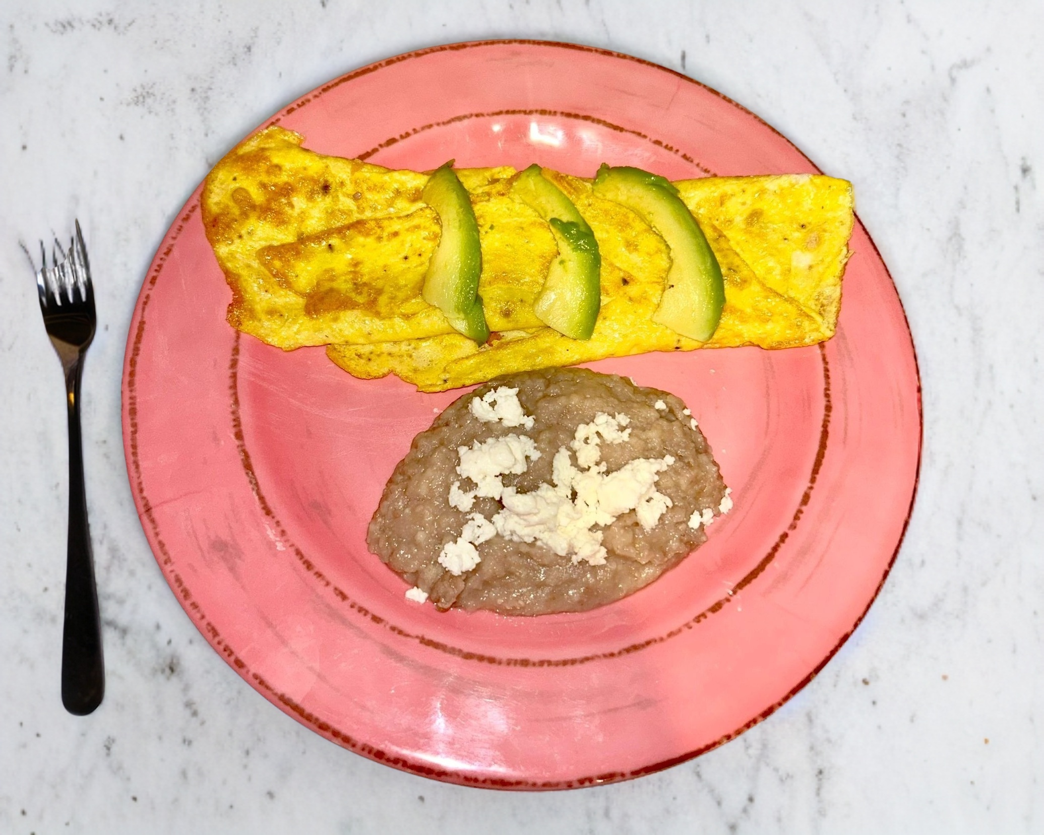 Huevos acompañados de frijoles refritos con queso.