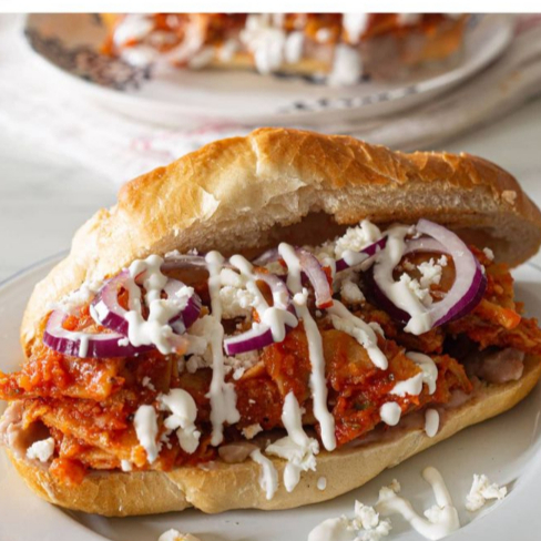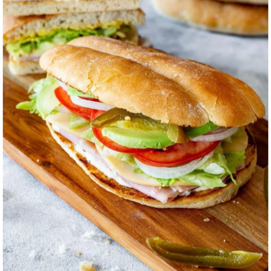 Clasica torta de jamón preparada con mayonesa, jamón de pavo, queso amarillo, vegetales como: lechuga, jitomate, aguacate, cebolla y picante