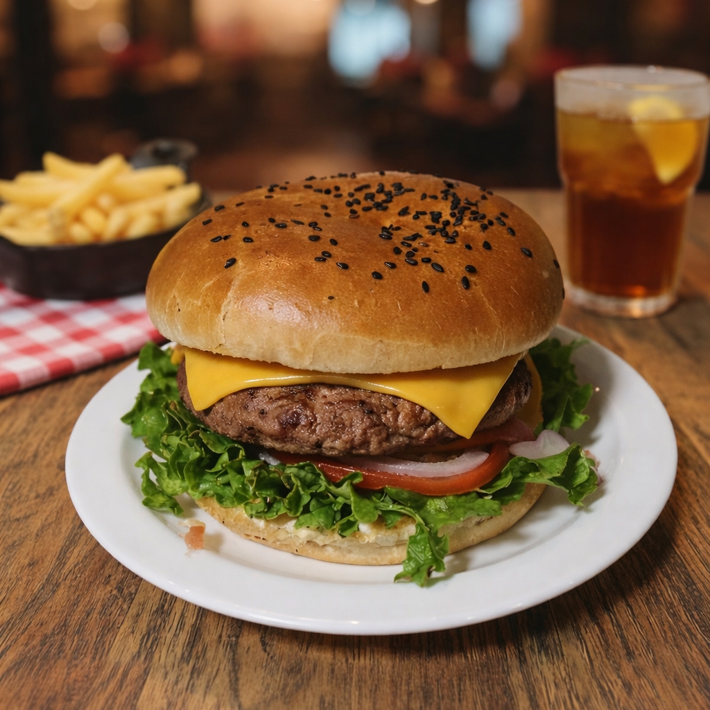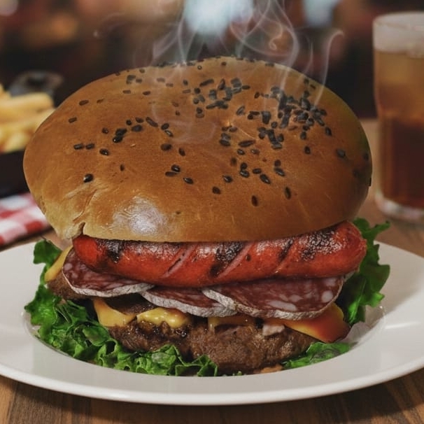 Carne de res USDA choice, queso americano, tocino crujiente, cama de carnes frías, queso fundido, jitomate, cebolla morada, lechuga italiana y aderezos.