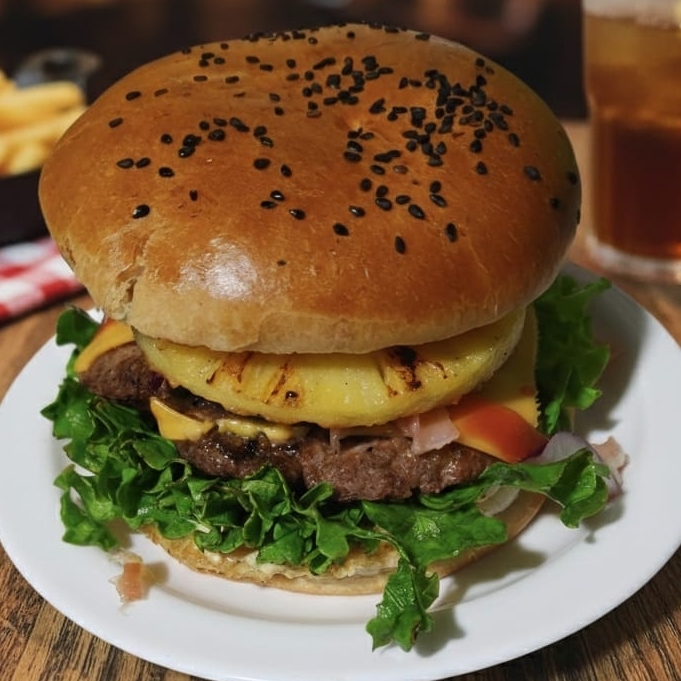 Carne de res USDA choice, queso americano, tocino crujiente, cama de carnes frías, queso fundido, piña, jitomate, cebolla morada, lechuga italiana y aderezo BBQ.