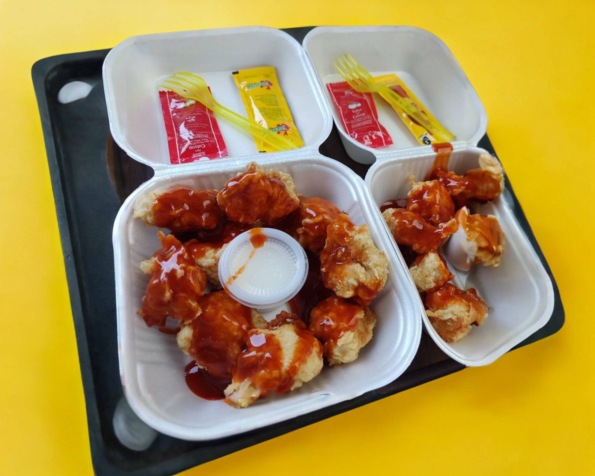 Orden de boneless de pechuga de pollo, acompañados de tu salsa favorita, ranch y complementos.
