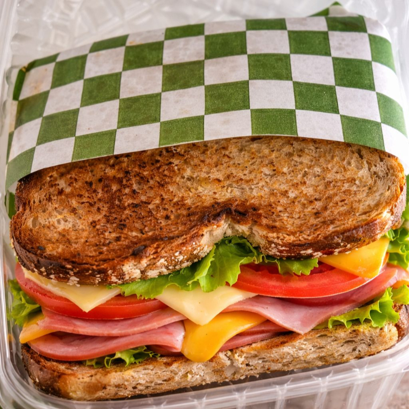 Pan Multigrano Integral, Jamón, Mezcla de quesos gratinados, Lechuga, Jitomate, Chiles en vinagre y Aderezo de la casa.