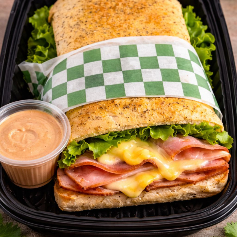 Pan de finas hierbas, Jamón, Mezcla de quesos gratinados, Lechuga, Jitomate, Chiles en vinagre y Aderezo de la casa.