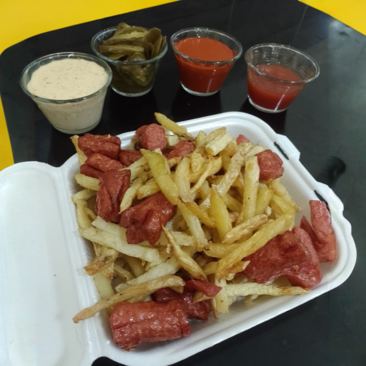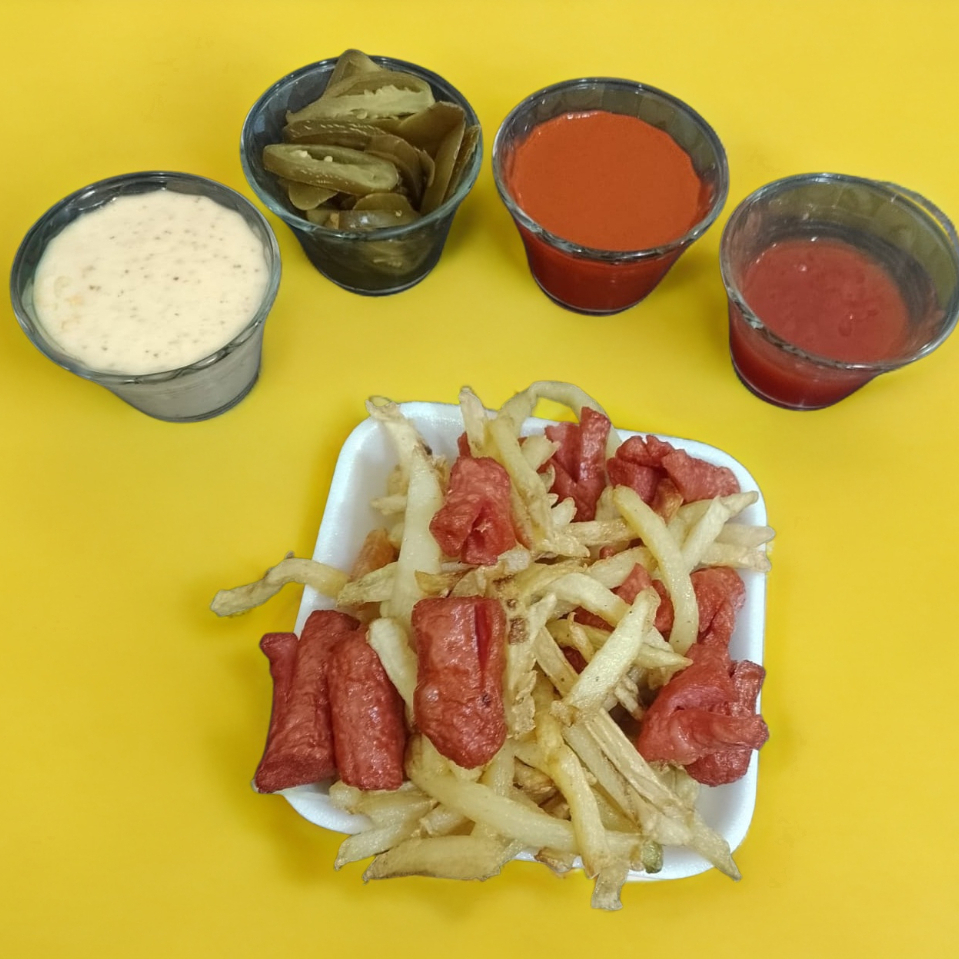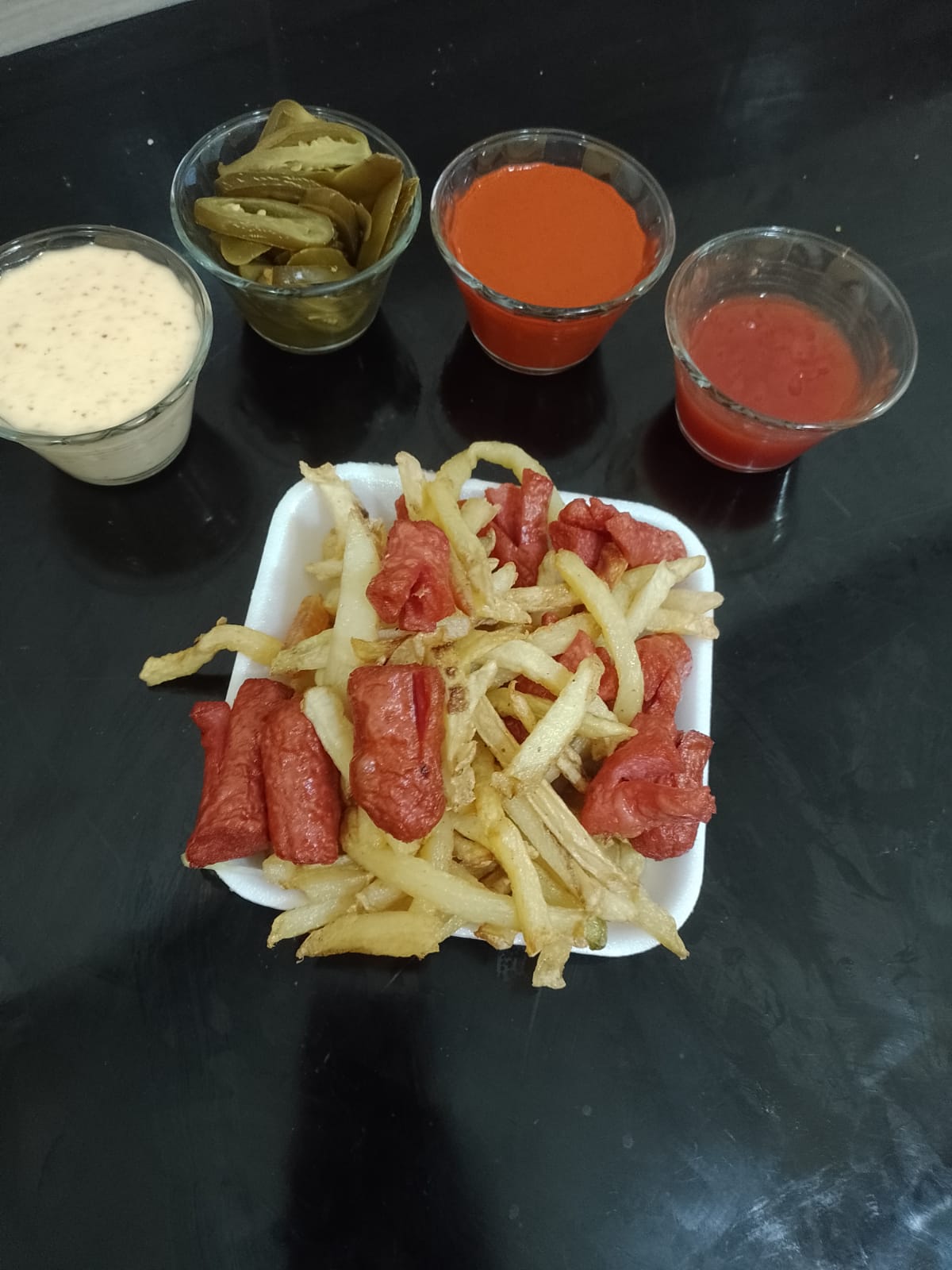 Orden de salchipapas chicas con sus aderezos, capsut, picante, y chi.kchurri