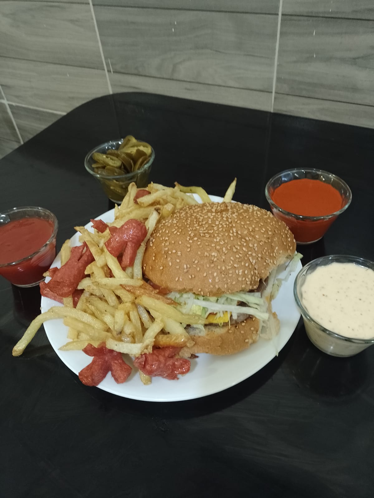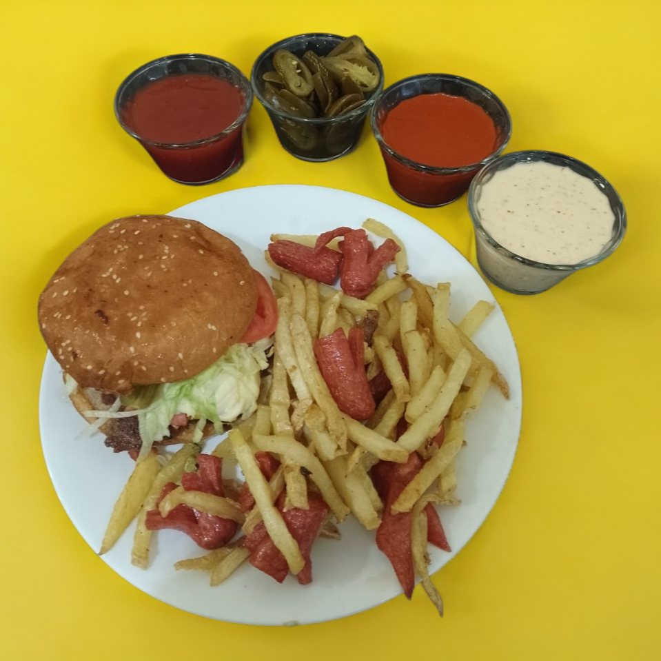 HAMBURGUESA JUMBO SENCILLA*1 + HAMBURGUESA CHICA CON SALCHIPAPAS*1