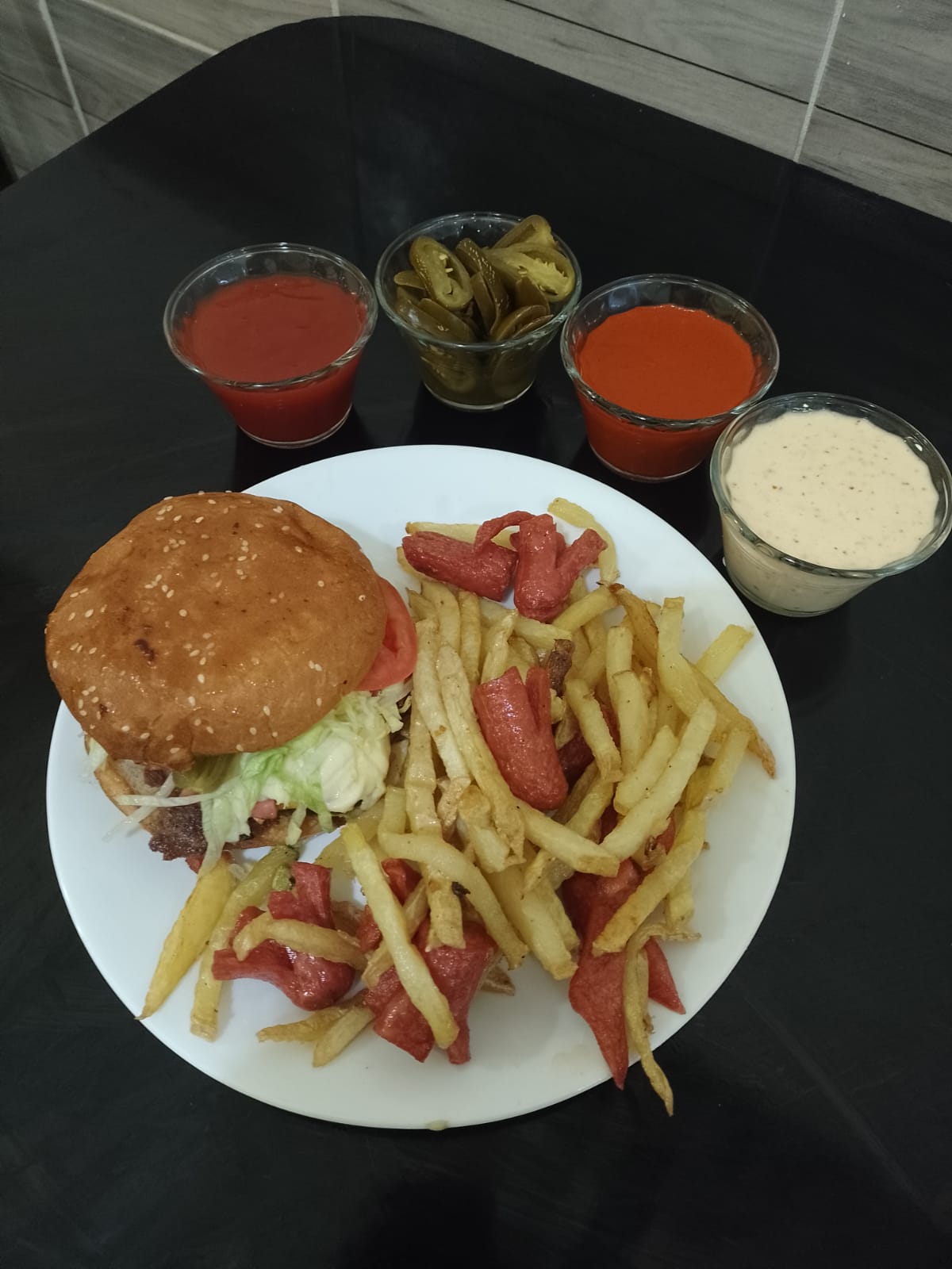 HAMBURGUESA JUMBO TOCINO CON SALCHIPAPAS