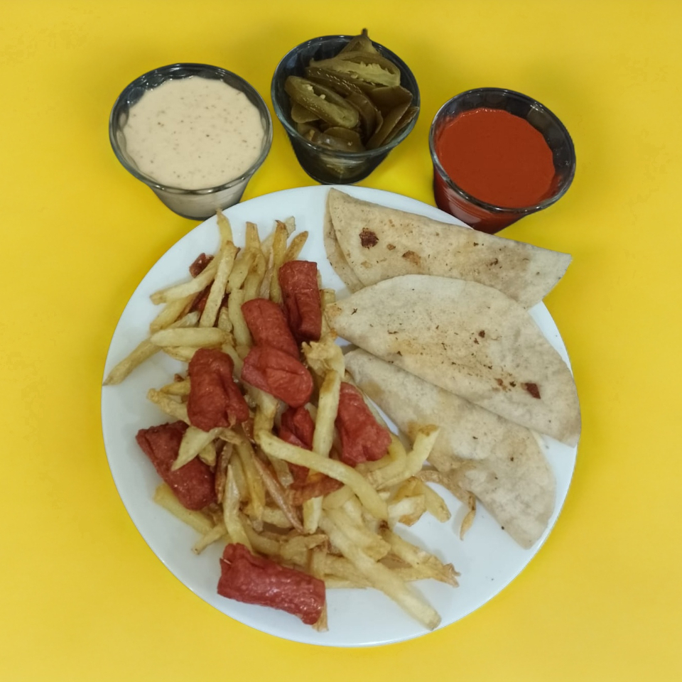 3 gringas de pastor con queso asadero acompañadas de salchipapas