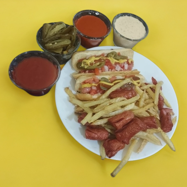 2 hotdog sencillo (jitomate, cebolla, chiles, capsut, mostaza y mayonesa acompañados de sachipapa.l