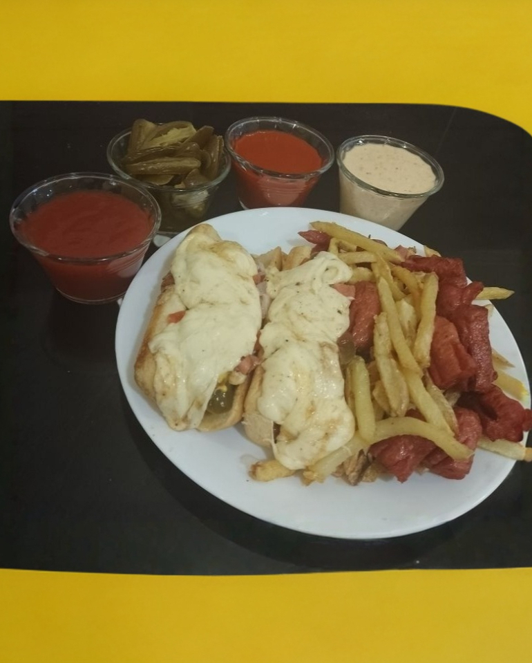 2 sincronizadas (jamón, queso amarillo, queso asadero) acompañadas de salchipapas