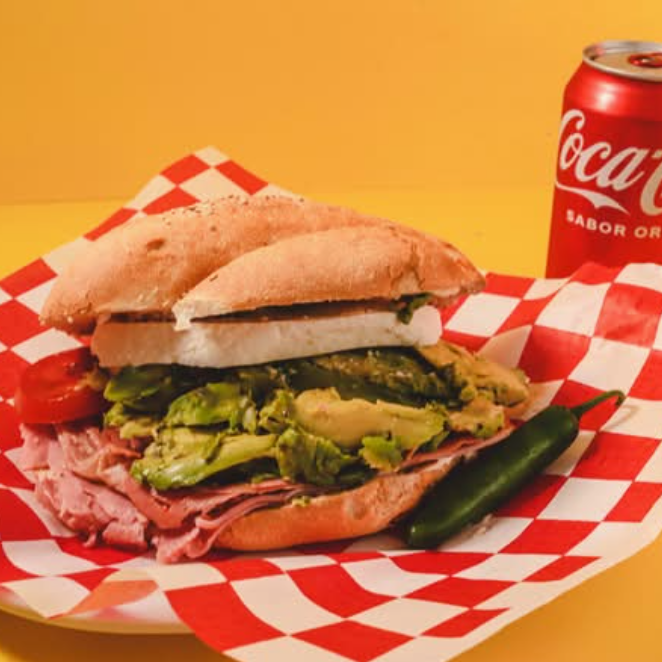 Refresco y torta gigante con mucho aguacate, triple porción de jamón de pierna, jamón pimiento, queso de puerco, queso blanco, mayonesa, jitomate y cebolla.