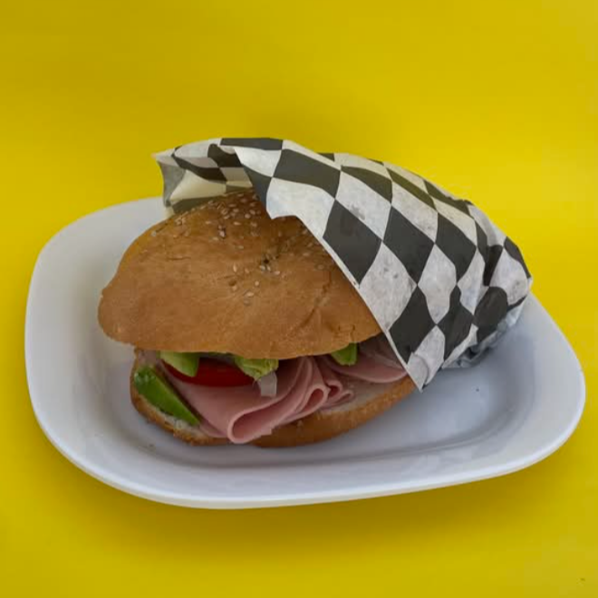 Doble porción de jamón de pierna, queso de puerco, 1 jamón pimiento, queso blanco, aguacate, jitomate, cebolla y mayonesa.