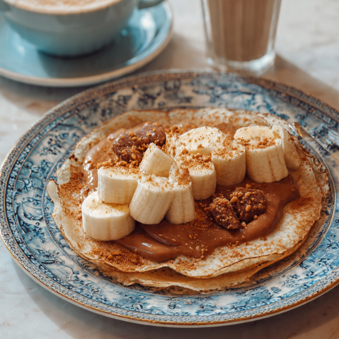 Crepa rellena de crema lotus biscoff, plátano y granillo de nuez, acompañado de frappé caramel biscoff de 10oz