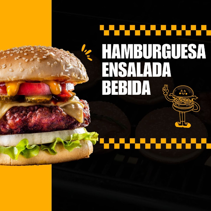 Hamburguesa de res, ensalada individual y bebida de 355ml