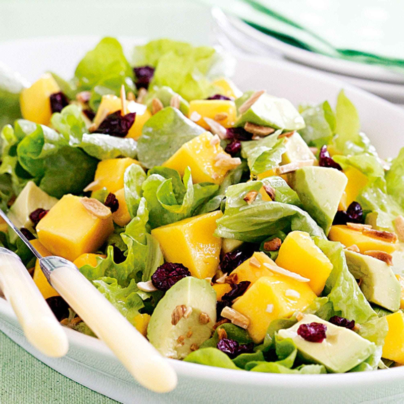 Mezcla de lechuga italiana, arándanos, mango, jitomate, aderezo y crutones