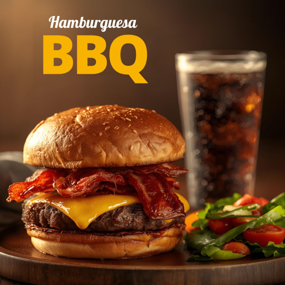 Hamburguesa con salsa BBQ, queso amarillo, cebolla y tocino, acompañada de ensalada de mango con arándanos y bebida de tu elección