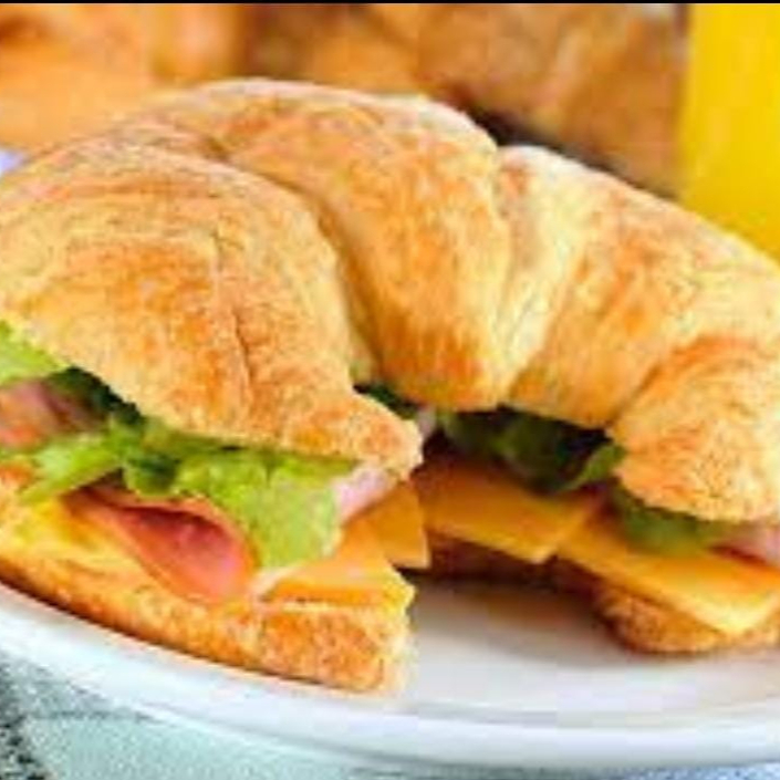 Cuernito con jamón, queso amarillo, lechuga, mayonesa y mostaza.