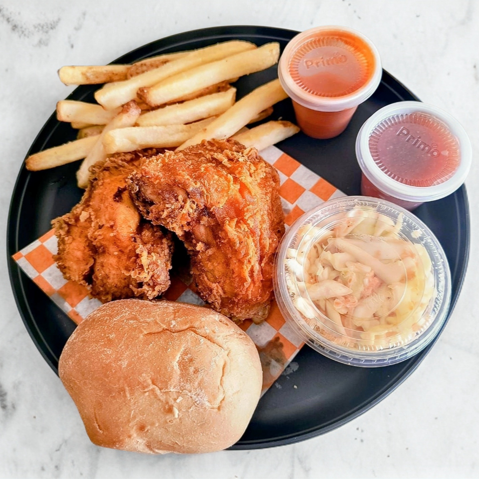 2 Pz (muslo y pechuga) Puré, Ensalada (4oz), Salsa, Catsup y 1 Bollito.
