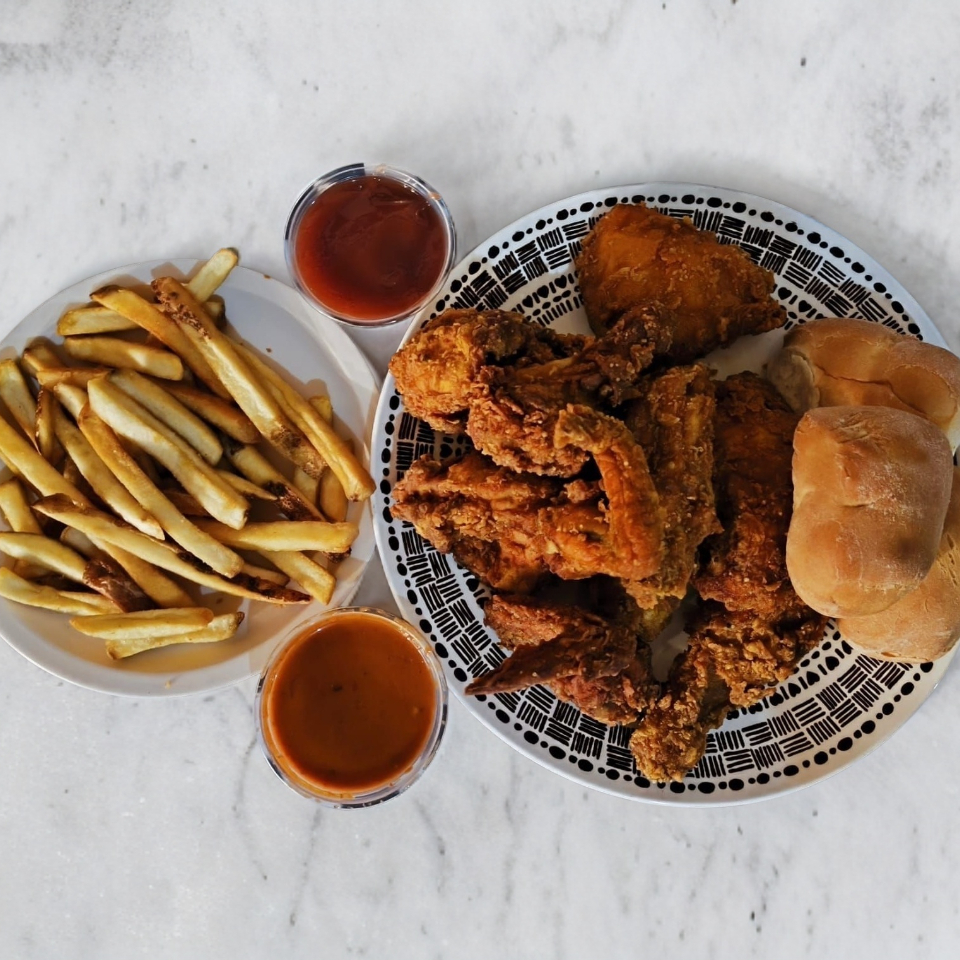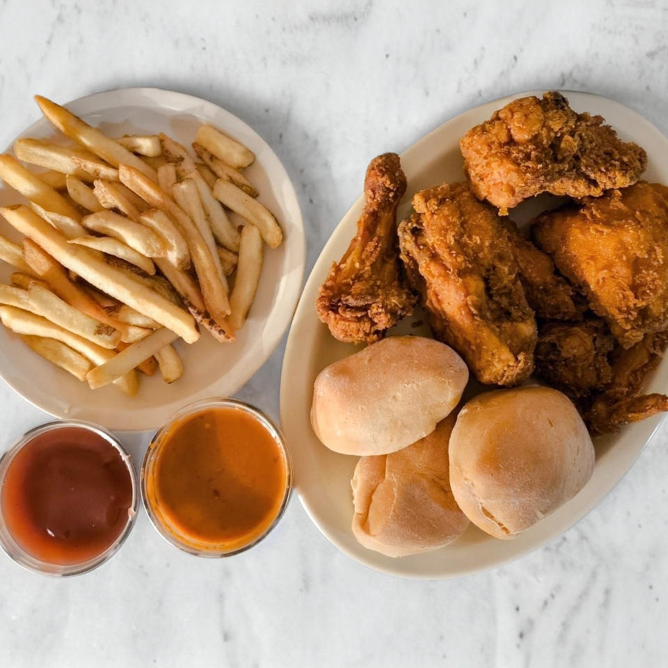 5 Pz (2 pechugas, muslo, pierna y ala), Papas a la Francesa (250g), Ensalada (250g), Salsa, Catsup (4oz) y 2 Bollitos.