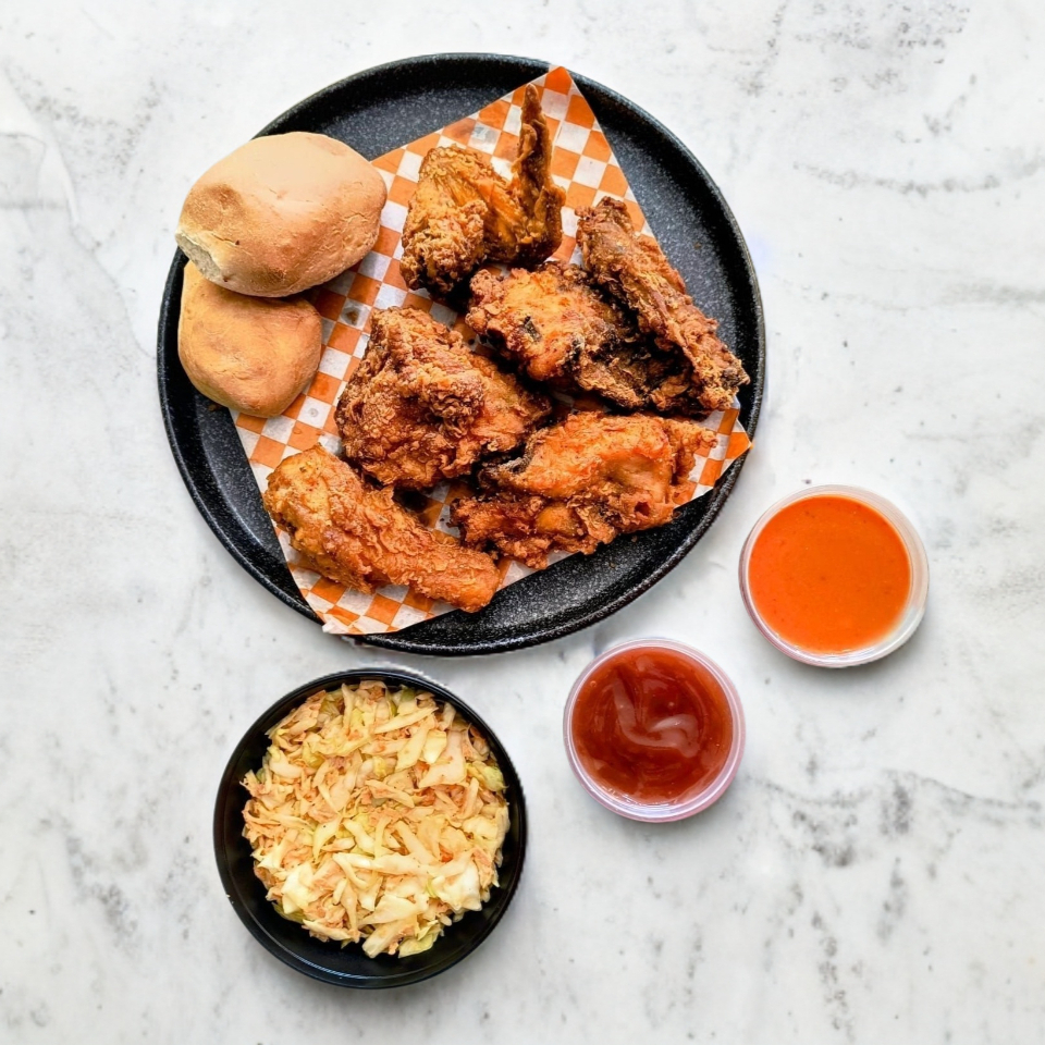 5 Pz (2 pechugas, muslo, pierna y ala), Ensalada (250g), Salsa, Catsup (4oz) y 2 Bollitos.