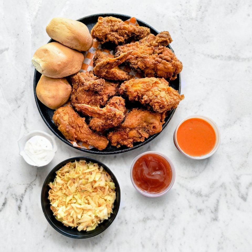 8 Pz (2 muslos, 2 pechugas, 2 alas y 2 piernas), Ensalada (250g), Salsa, Catsup (4oz) y 3 Bollitos.