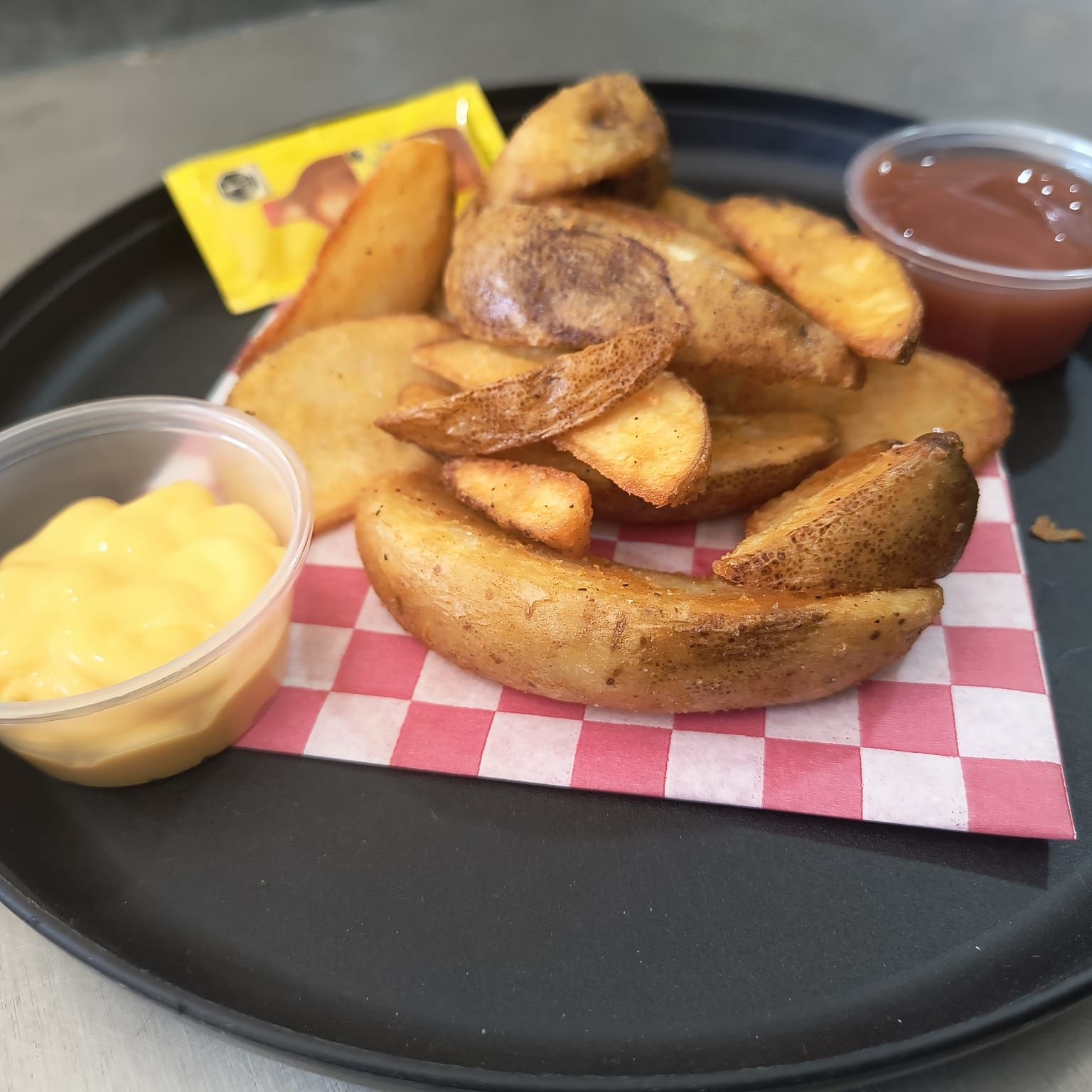 250g de Crujientes Papas Gajo. Incluye Catsup y Queso amarillo