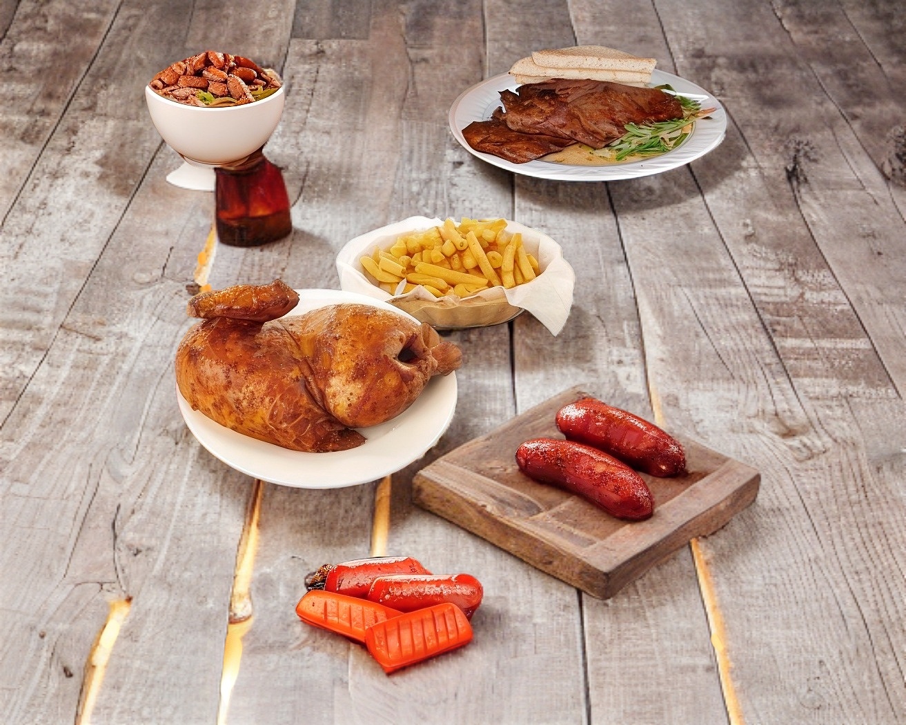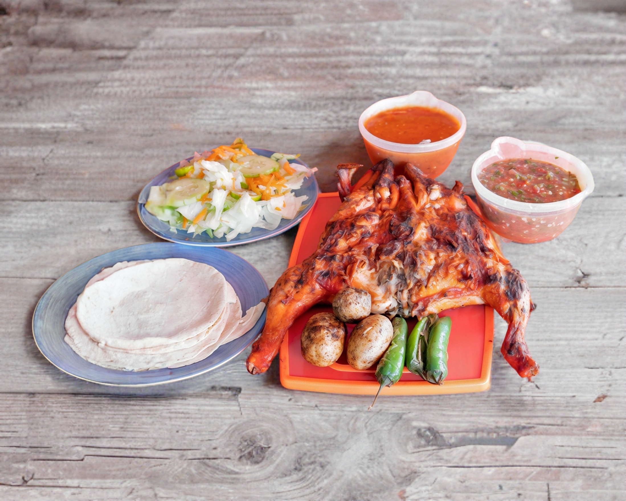 1 pollo asado chico + 3 salchichas. Incluye tortillas, salsas, cebollitas o papitas y chiles asados. (Para 4 personas).
