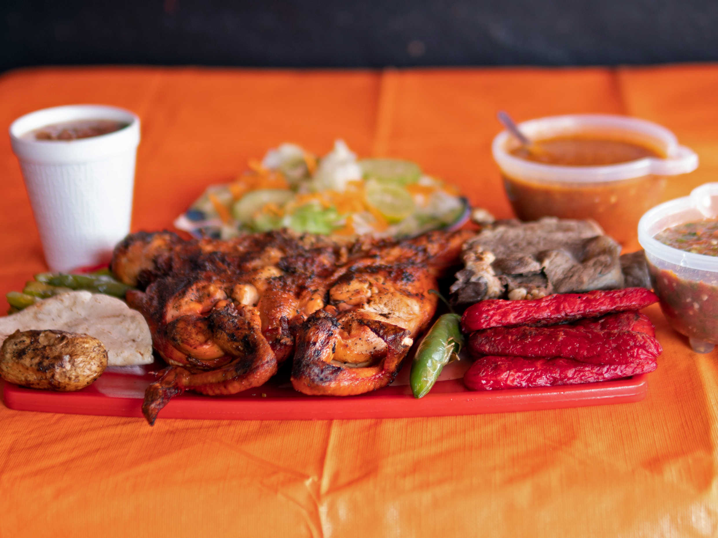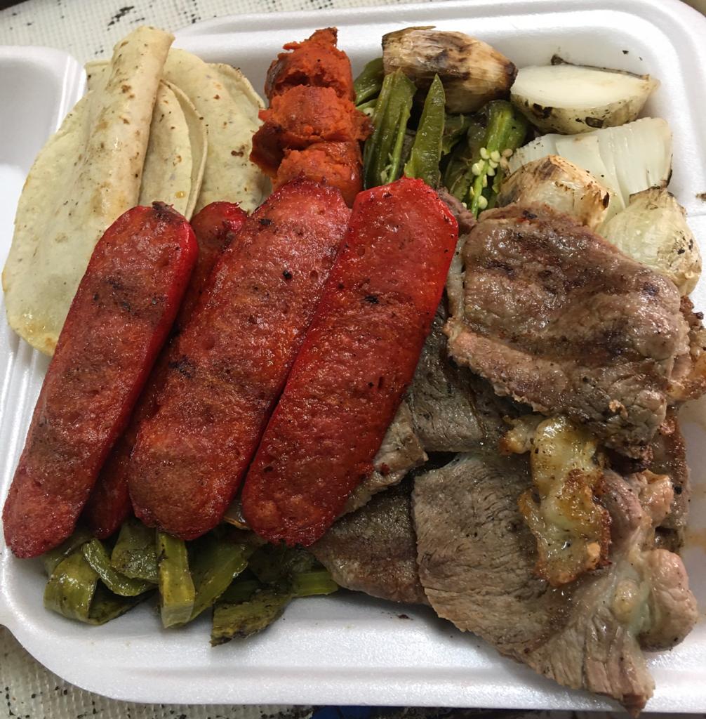 1/2 pollo mediano + 250 gr de carne + 2 salchichas. Incluye tortillas, salsas, cebollitas o papitas y chiles asados. (Para 3 personas).