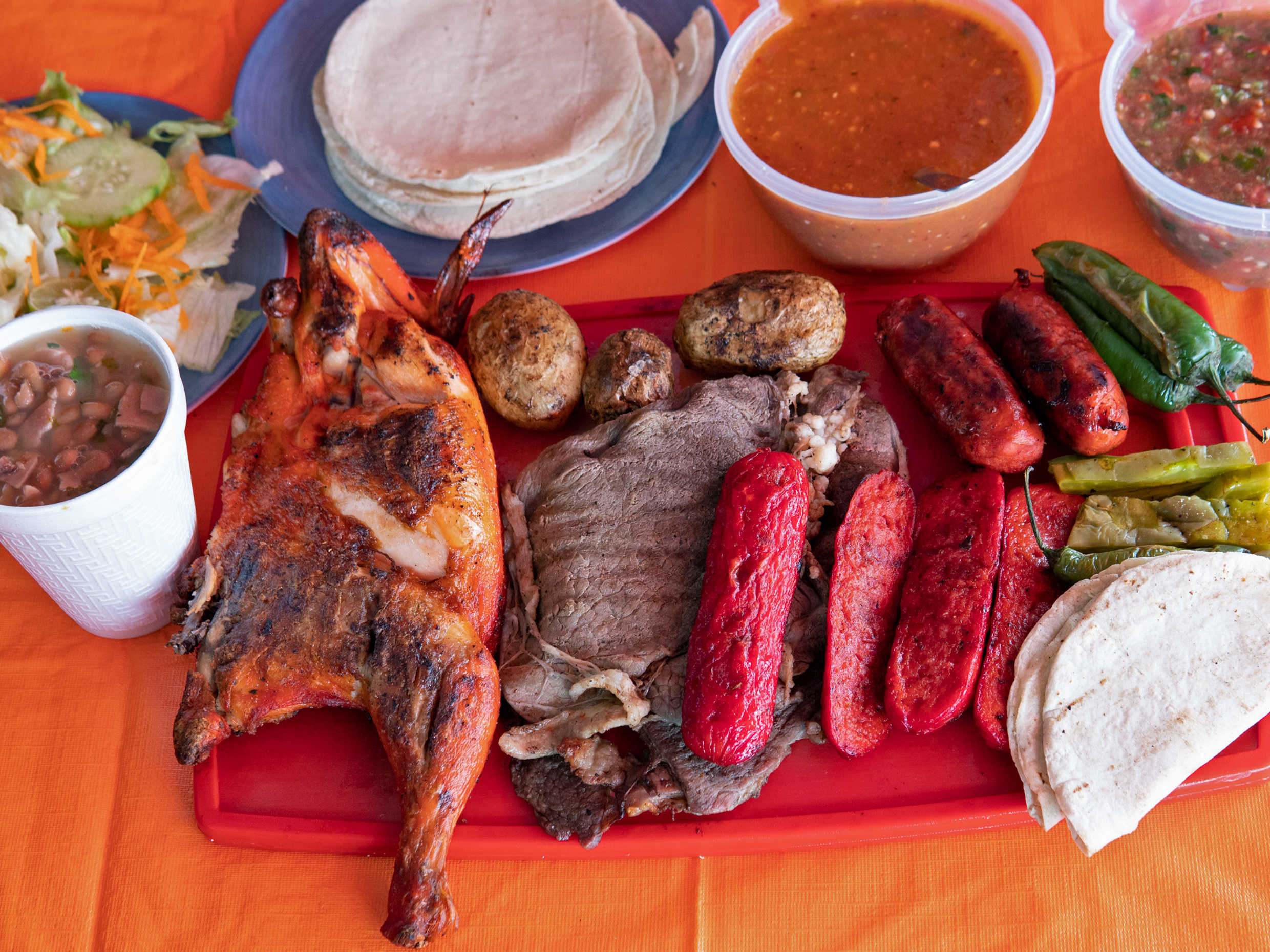 1/2 pollo grande + 250 gr de sirloin + 2 salchichas + 250 gr de papas + 2 chorizos, 250ml de frijoles charros, tortillas, salsas, , cebollitas o papitas y chiles asados. (Para 4 personas).