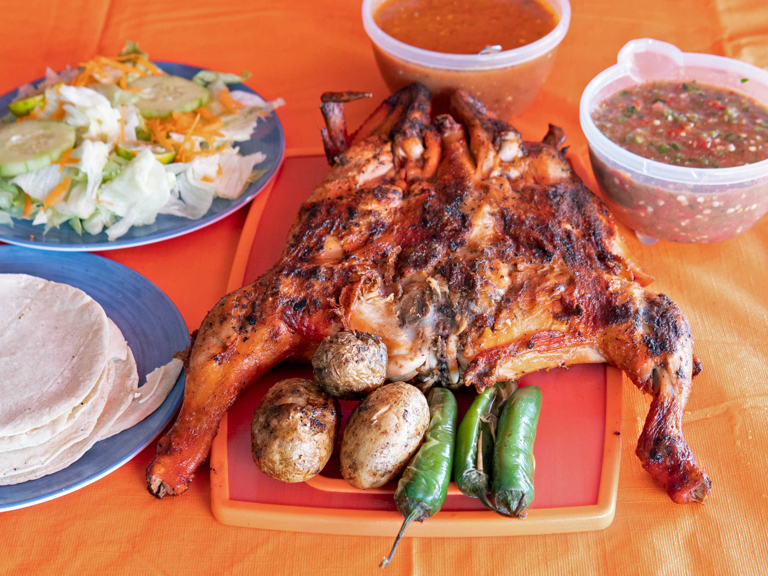 Elige la cantidad. 1/2 pollo asado con tortillas, salsas, cebollitas y chiles