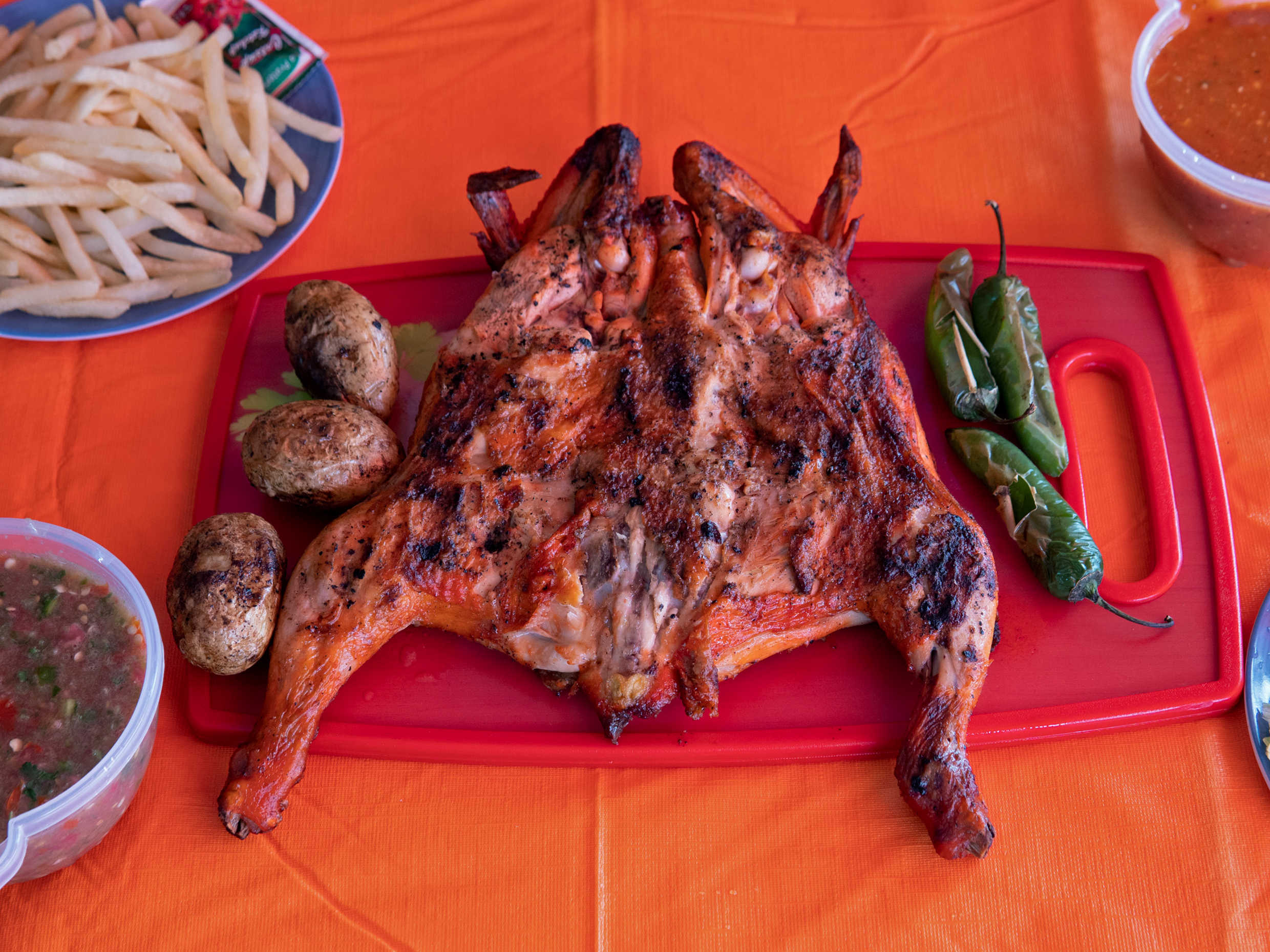 Incluye 1 pollo asado chico, 250 te de papas a la francesa, 1/4 k Arrachera con salsas, tortillas, cebollas chiles asados
