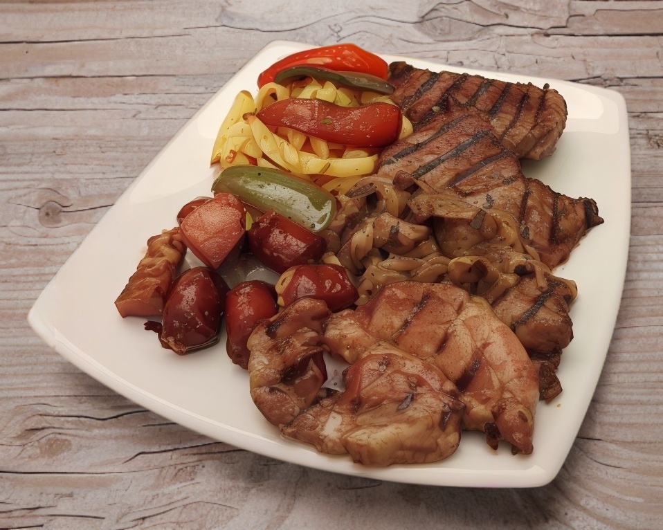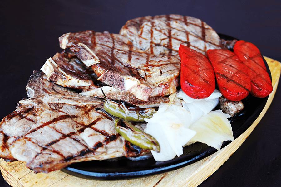 1/2 kg de sirloin de res sin hueso, acompañada de 2 salchichas asadas, quesadillas, nopal asado, salsas tortillas, cebollas y chiles asados