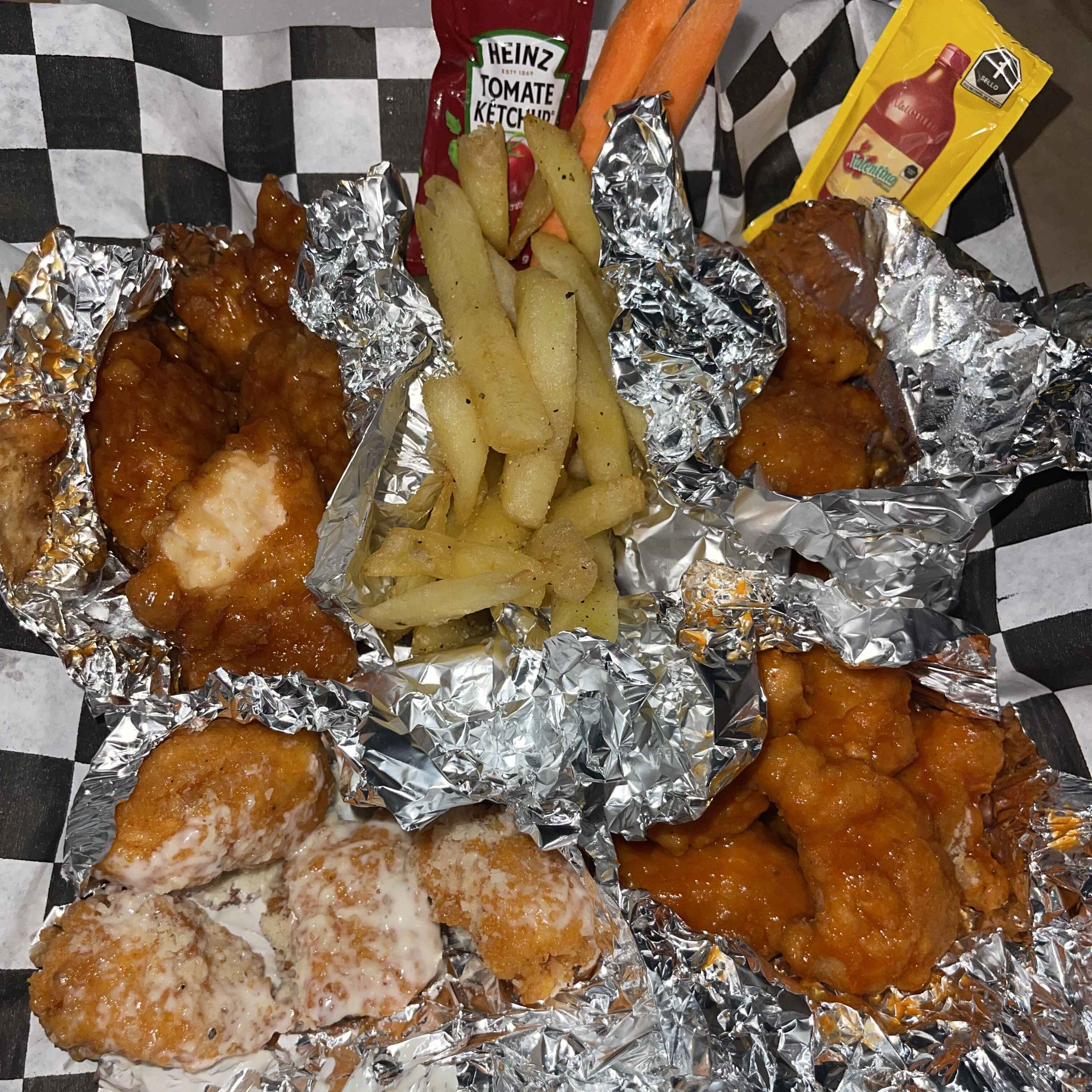 20pz grandes con sus salsas de elección,verdura y porción de papas fritas.🍟