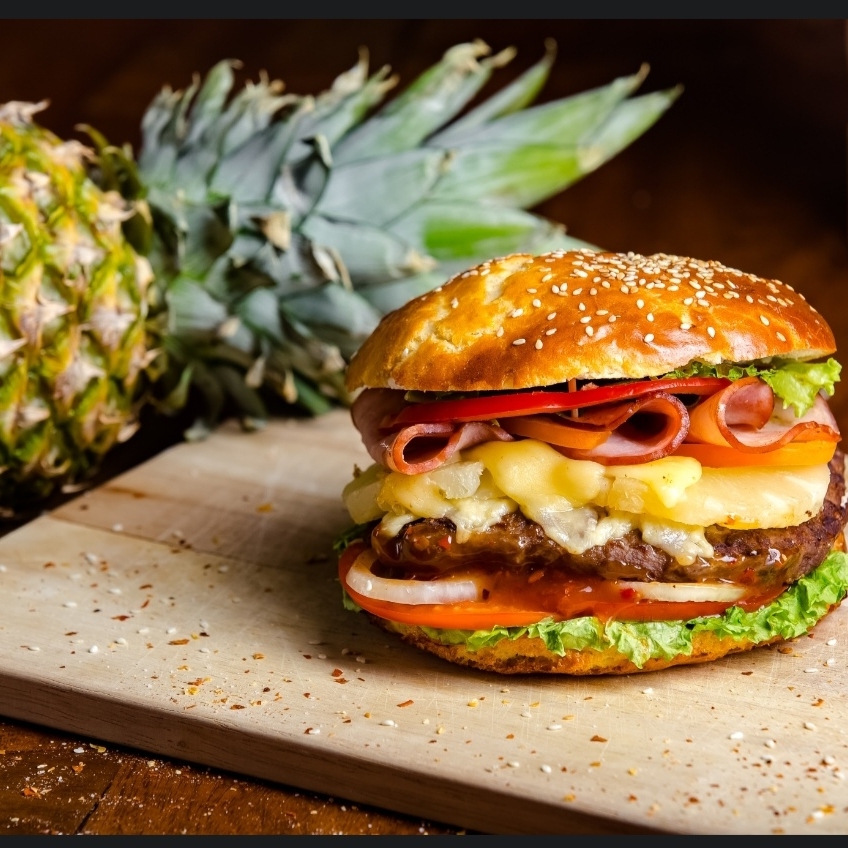 Pan de hamburguesa, carne 💯 % de res, jamón, queso, piña, lechuga, tomate y cebolla al grill
