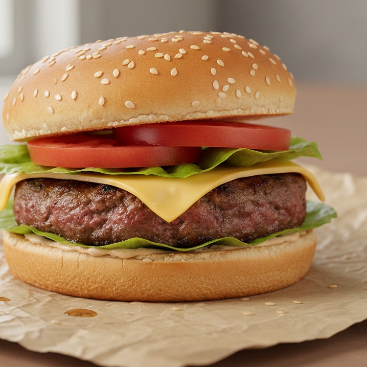 Pan de hamburguesa, carne 100% de res o pechuga de pollo, queso, lechuga, tomate y cebolla grill