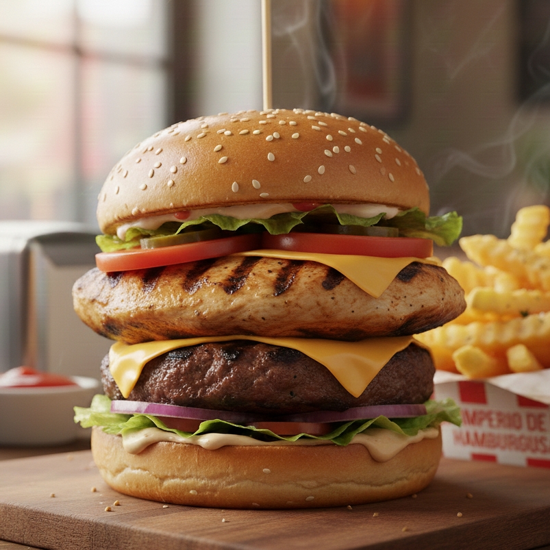 Pan de hamburguesa, carne 💯 % de res, pechuga de pollo, queso, tocino, lechuga, tomate y cebolla grill
