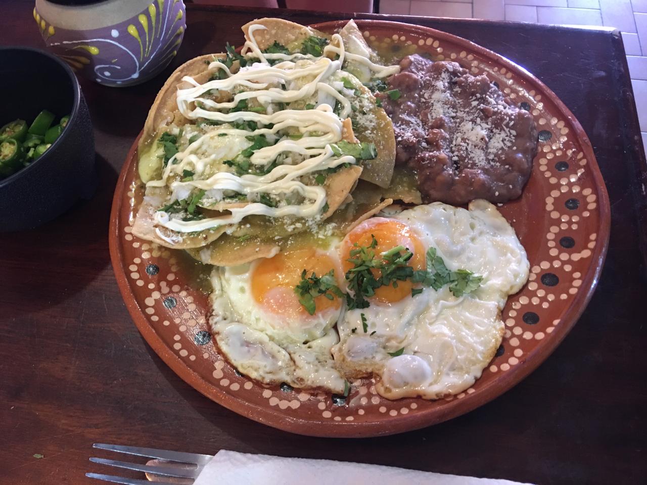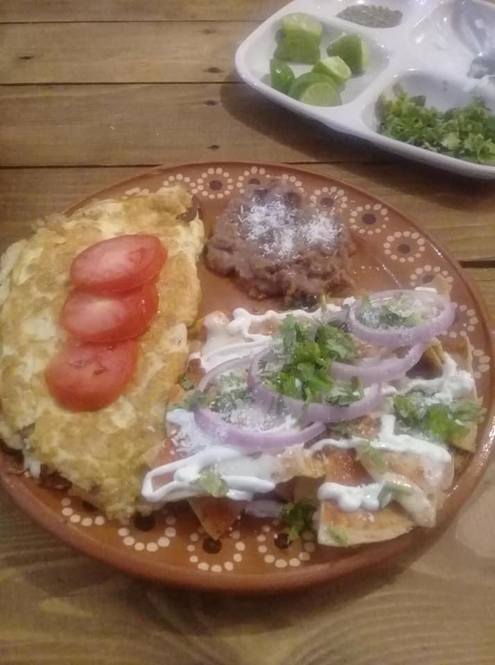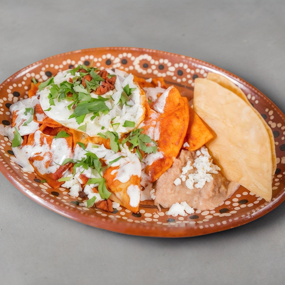 Deliciosos chilaquiles bañados con la salsa de su elección, queso, crema, cebolla y cilantro.