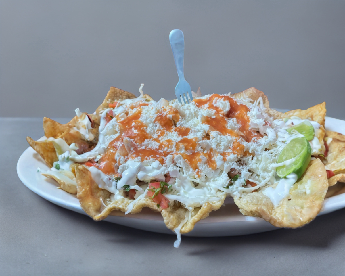 Repollo, pico de gallo, cueritos, limon, crema, queso blanco, salsa casera y salsa valentina