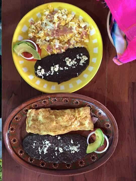 Incluye: jugo de naranja chico, café de olla chico, fruta y huevos al gusto (huevo revuelto con jamón o salchicha o tocino o chorizo o huevos estrellados naturales o rancheros o divorciados, acompañados con frijoles y tortillas de maíz recién hechas.