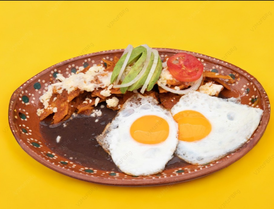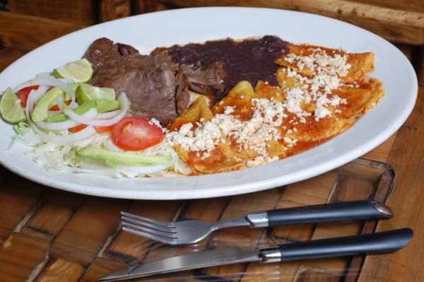 Con pollo o huevo revuelto o huevos al gusto, bañados en la salsa de tu elección poco picosa ó no picosa o muy picosa, decorados con crema, queso, rodajas de jitomate, cebolla y aguacate, acompañados de frijoles y bolillo.